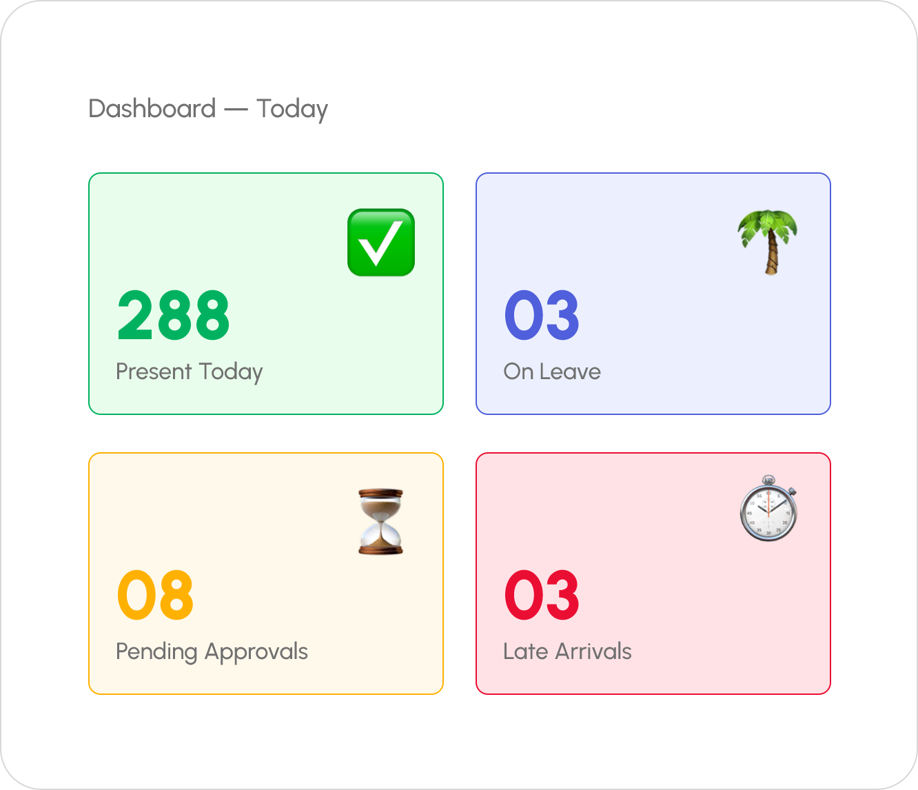 HR sees company-wide metrics. Managers see their teamβs data. Employees see their personal summary β todayβs status, leave balance, upcoming holidays, and recent payslips. Everyone gets the information that matters to their role.